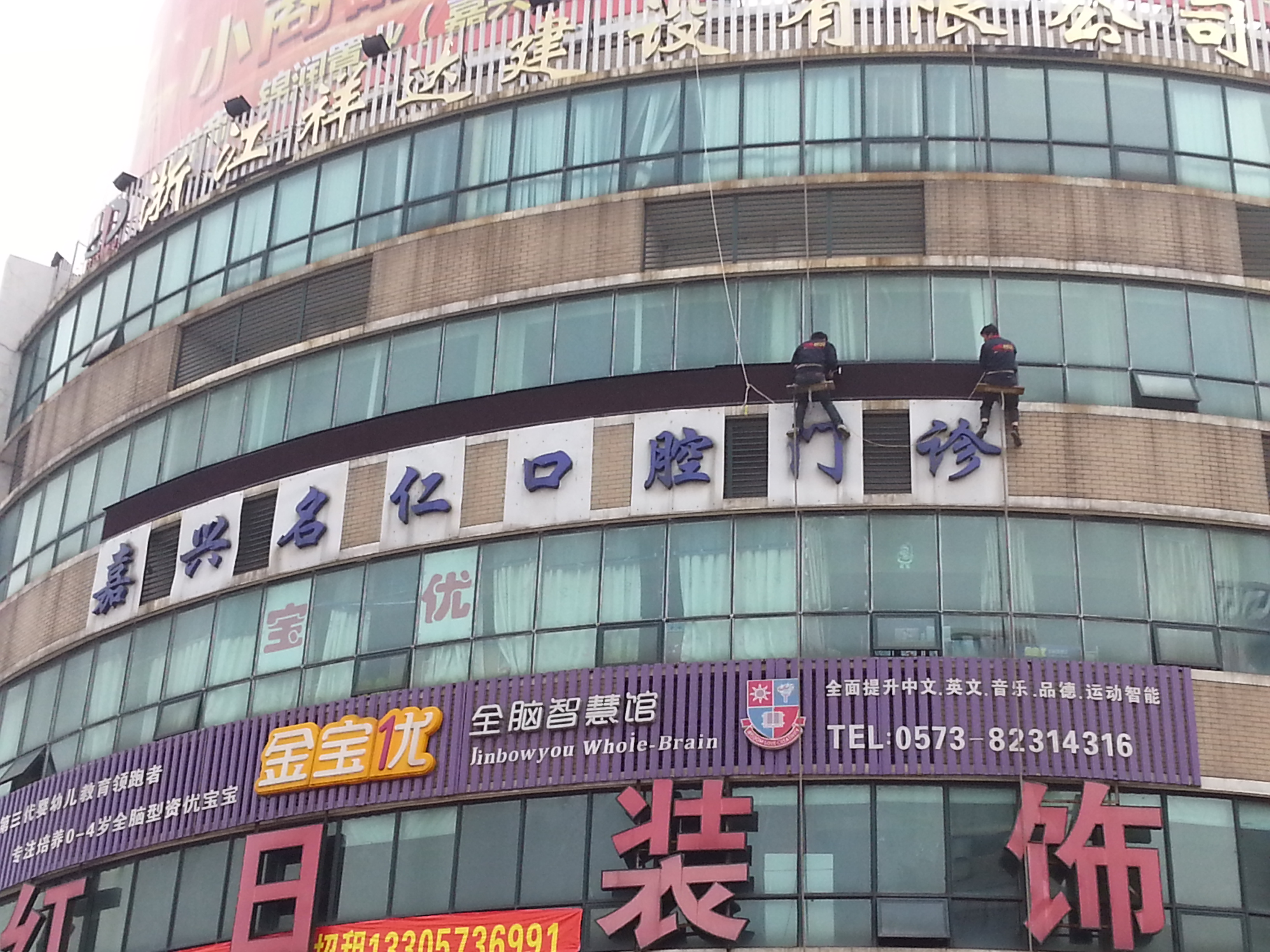 偉亮標(biāo)識(shí)的師傅們?cè)诩徆ぢ愤@邊,從樓頂下吊繩安裝口腔門診的顯示屏,這LED顯示屏采用了全戶外單紅,防水性功能都是非??梢缘模谕砩巷@示出來的字體都是紅色大體,非常能吸引客戶。